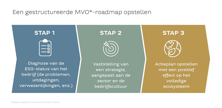Concreet verloopt de ontwikkeling van een gestructureerd plan in drie fasen (zie infografiek). Het uiteindelijke doel is om duidelijke stappen te bepalen die een positieve impact hebben op het volledige ecosysteem van het bedrijf. Bijvoorbeeld door: