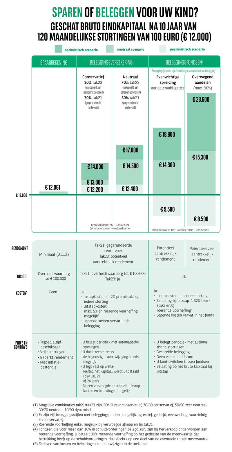 Stel dat u iedere maand 100 euro wilt sparen voor uw oogappel. Welke spaar- of beleggingsformule kiest u dan? Met een spaarrekening is uw opbrengst beperkt. Met een beleggingsverzekering of beleggingsfondsen mikt u op een potentieel hoger rendement. Weliswaar zonder garantie voor de toekomst, geeft een simulatie op basis van het verleden u een idee.