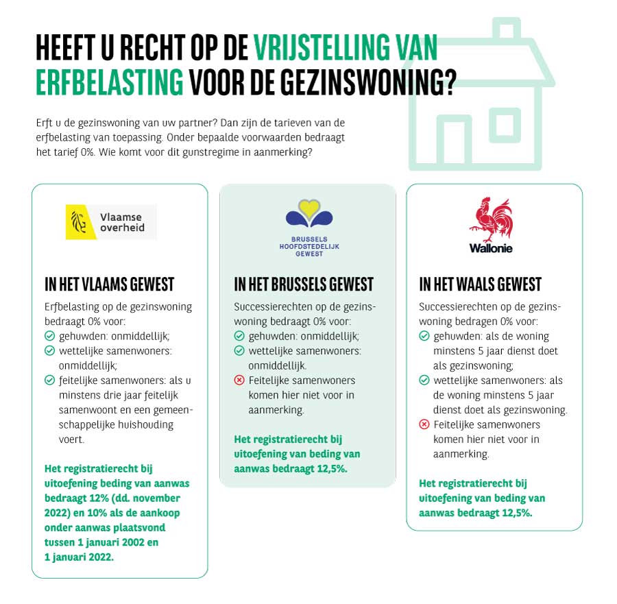Een aanwasbeding voor de gezinswoning is fiscaal soms nadelig door registratierechten (12 of 12,5%). Dat is vaak duurder dan een vererving via testament. Die vererfde woning is tussen partners vaak vrijgesteld van erfbelasting (zie infografiek).