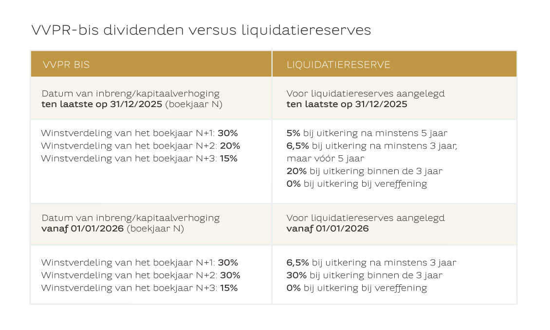 Het VVPR-bis regime is van toepassing voor dividenden van aandelen die uitgegeven zijn na 1 juli 2013 door middel van een kapitaalinbreng of -verhoging (in geld). Na een specifieke wachttermijn vallen de uitgekeerde dividenden onder een verlaagde roerende voorheffing van 15%. Voor aandelen uitgegeven tot 31 december 2025 blijven de oude wachttermijnen van toepassing.