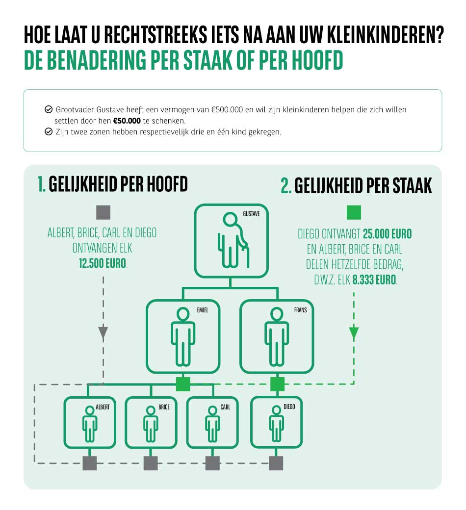 Een voorbeeld: grootvader Gustave had twee zonen, Emiel en Frans, die respectievelijk drie en één kind(eren) kregen. Wil hij zijn kleinkinderen op gelijke voet behandelen? Of is hij van plan om per staak (of tak) een identiek legaat te maken, zodat geen van zijn eigen kinderen benadeeld is?